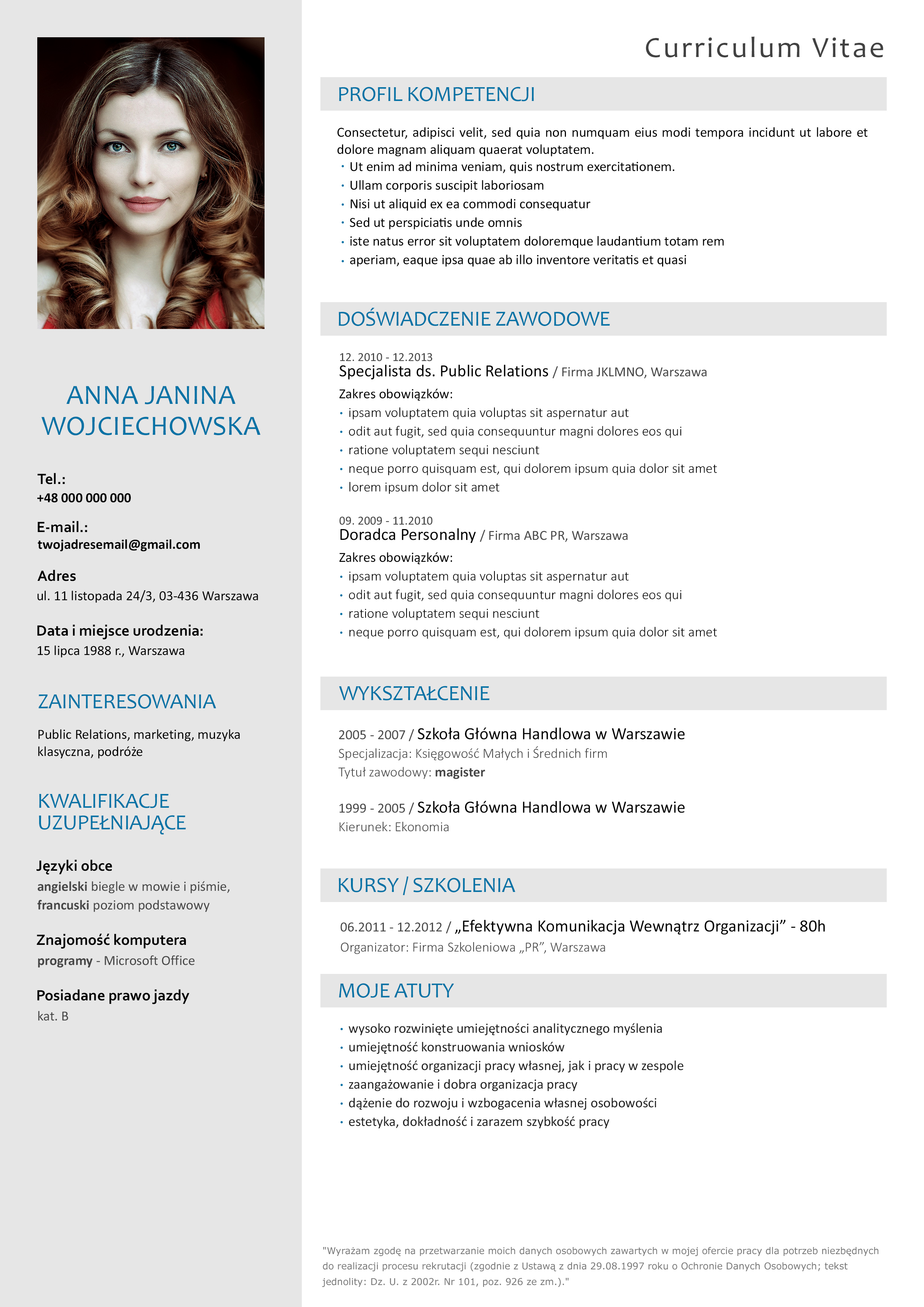 Warto sprawdzić, czy adres, telefon i e-mail są podane poprawnie. Ewentualny błąd sprawi, że osoba odpowiedzialna za rekrutację nie będzie mogła się z Tobą skontaktować. Adres e-mail powinien mieć oficjalne brzmienie (imię.nazwisko@ a nie buziaczek@, czy twardziel@).